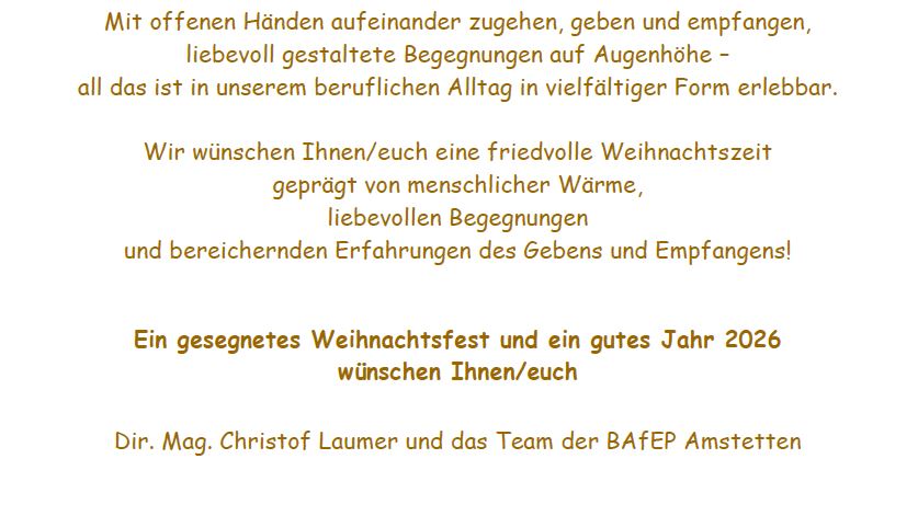 Ein gesegnetes Weihnachtsfest und ein gutes Jahr 2026 wünschen Ihnen/euch Dir. Mag. Christof Laumer und das Team der BAfEP Amstetten