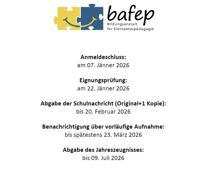 Du möchtest gerne unsere Schule kennenlernen? Melde dich einfach für einen Schnuppertag im Sekretariat an! Tel.: 0660 / 99299 35 oder bafep.amstetten@noeschule.at Montag – Donnerstag 07:00 – 14:00 Uhr, Freitag 07:00 – 12:00 Uhr