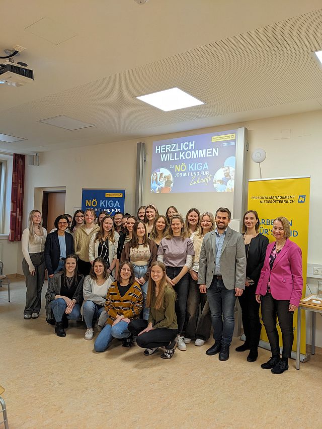 Angela Schobel, die zuständige Kindergarteninspektorin für den Bezirk Amstetten, begleitet von zwei Mitarbeiter*innen aus dem Bereich Personalangelegenheiten des Amts der NÖ Landesregierung, besuchten unsere Schule. Ihr Ziel war es, die Schülerinnen der 5. Klassen als potenzielle künftige Mitarbeiterinnen für das Land NÖ in elementarpädagogischen Einrichtungen zu gewinnen. Im Mittelpunkt stand die Präsentation des Landes NÖ als Arbeitgeber sowie die Bereitstellung von Informationen zum Bewerbungsprozess und zur Tätigkeit als Elementarpädagogin. Darüber hinaus hatten die Schülerinnen die Möglichkeit, Fragen zu stellen, die von den Besucher*innen beantwortet wurden.