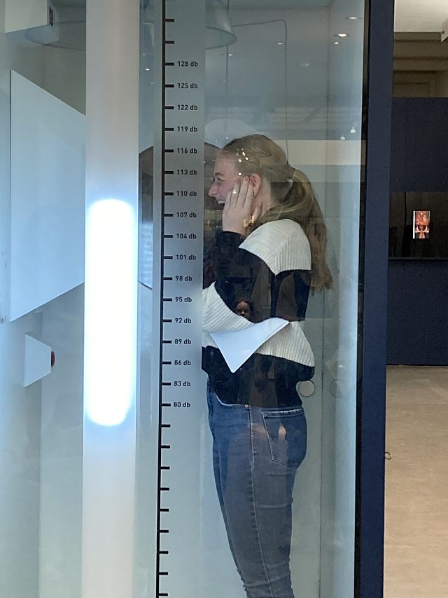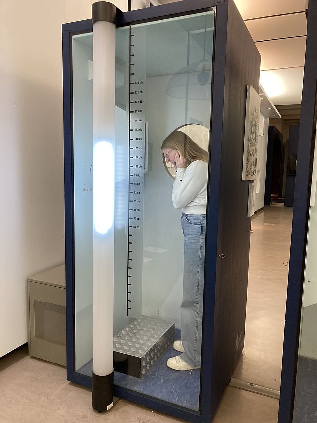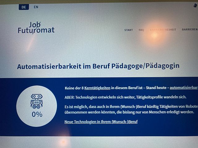 Hier seht ihr die 5B, wie sie sich im TMW via Audio-Guide über verschiedene Berufswelten informiert, sich am „Heißen Draht“ oder als ZIB-Sprecherinnen erprobt oder in der Schreikabine den Dezibelpegel in die Höhe schießen lässt. Im Museumsbereich über Künstliche Intelligenz erfuhren wir zudem vom Job-Futuromat, dass wir Pädagoginnen und Pädagogen in unseren Kompetenzen unersetzbar sind, nämlich zu 0% Wahrscheinlichkeit durch Automatisierung oder KI austauschbar 😉
