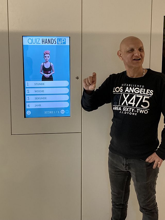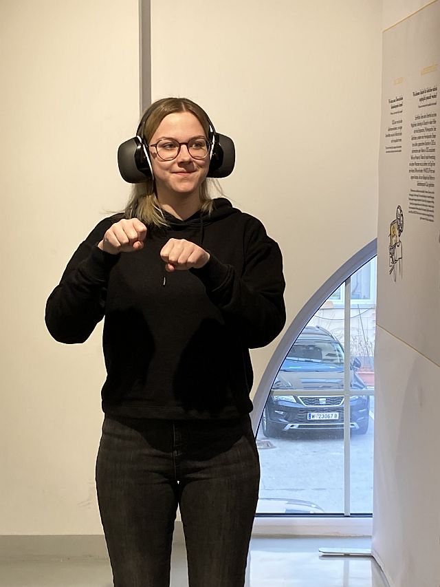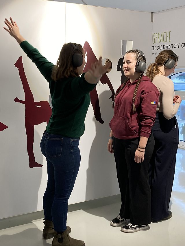 In der vom Verein Equalizent bespielten interaktiven Ausstellung „HandsUp“ über die Welt der Gehörlosen wurde unser Hörsinn durch dicke Kopfhörer völlig ausgeschaltet und wir lernten, uns mittels Mimik und Gestik zu verständigen bzw. unserem gehörlosen Guide zu folgen. Mittels verschiedener Stationen erlernten wir einige Gebärden, spielten „Stumme Post“ mit Mimik und Gestik oder versuchten uns in Gebärden-Karaoke!