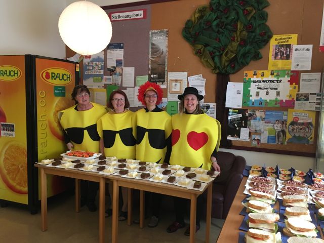 Auch im heurigen Schuljahr organisierte die Lehrergemeinschaft am Faschingsdienstag eine gesunde Jause. Die selbst gebackenen Kuchen und belegten Brote wurden von Lehrerinnen und Lehrern in der großen Pause zu je einem Euro verkauft. Der Erlös von mehr als €200 wird wieder zur Unterstützung von sozialen Projekten verwendet.