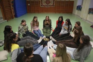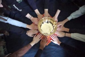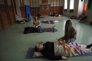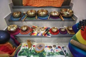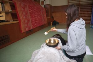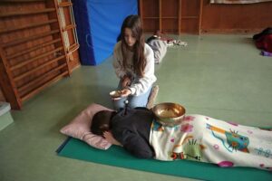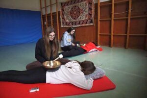 In einer Gruppe konnten die Schülerinnen in den Klang der obertonreichen Klanginstrumente eintauchen und ihre Herkunft, Herstellung und Handhabung kennenlernen. Dabei waren keinerlei Vorkenntnisse notwendig. Alle Instrumente, u.a. Klangschalen, Monochord, Steel Tongue Drum, Koshi, Klangkugel…, harmonieren, gleichzeitig gespielt, miteinander.
