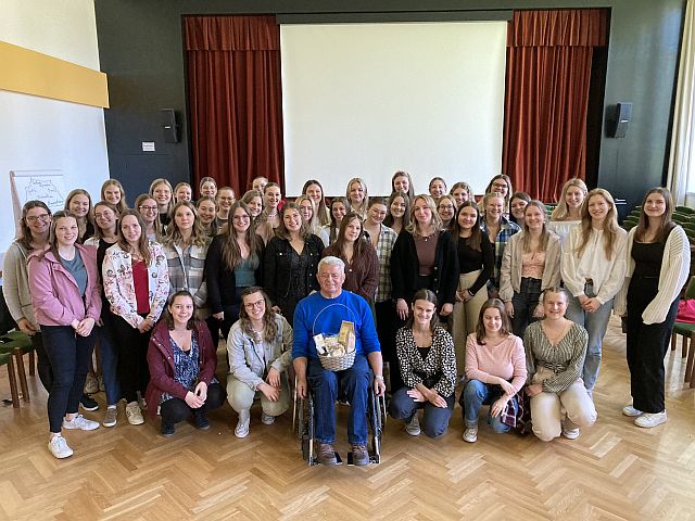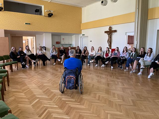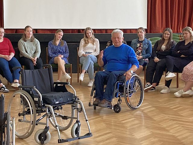 Am 26. April besuchte uns Herr Anton Schagerl, der seit einem Paragleit-Unfall vor 25 Jahren mit einer inkompletten Querschnittslähmung im Rollstuhl sitzt. Mit großer Offenheit erzählte er den beiden Maturaklassen aus seinem Leben, von seiner Reha, von den Freuden und auch Barrieren im Alltag.