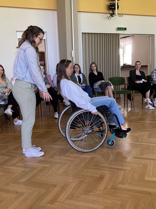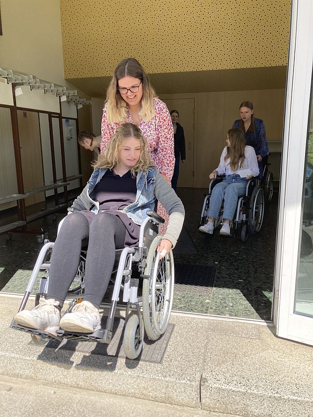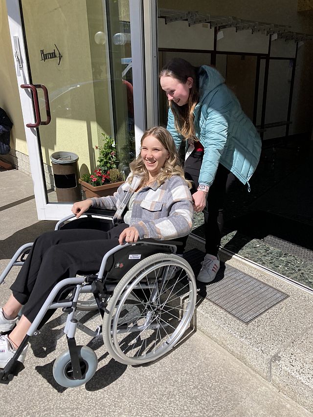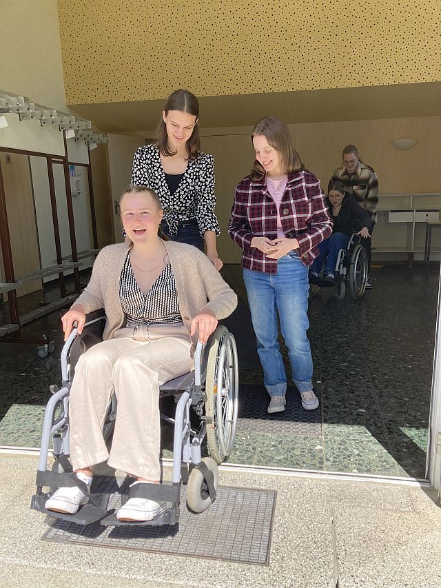 Den Höhepunkt des Projekts bildete die Eigenerfahrung: Mit einem ganzen Pulk an von der Firma Bandagist Gattringer dankenswerterweise zur Verfügung gestellten Rollstühlen wagten sich die Schülerinnen an ihre „Rollstuhl-Challenge“: Sie zogen Kärtchen und erledigten dann im Rollstuhl sitzend und als Begleitperson agierend verschiedene Aufgaben: einkaufen oder Geld abheben aus der Perspektive einer Rolli-Fahrerin, Kleidung im Geschäft probieren, den vertrauten Weg zum Bahnhof zurücklegen und sich nach barrierefreien Reisemöglichkeiten erkundigen, u.v.a.m.