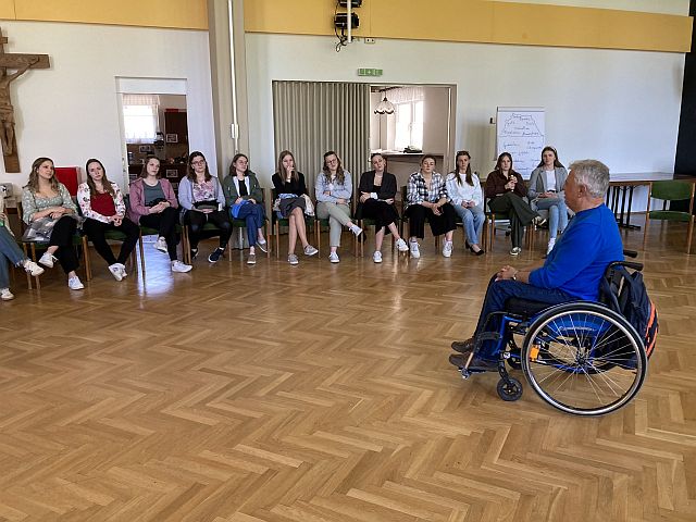 Danach erklärte er uns den Umgang mit einem Rollstuhl, vom Aufklappen ohne sich die Finger einzuklemmen, bis zum Begleiten von im „Rolli“ sitzenden Kindern.