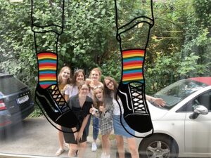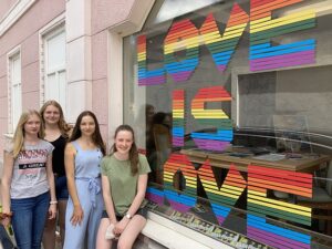 Die 3B entwickelte in der Homeschooling Zeit Entwürfe zum Thema „Vielfalt“. Mit Klebestreifen sollten Motive auf den Galeriefenstern von KIAM angebracht werden. Die 1B/b unterstütze in der Umsetzungsphase. Diese Bilder waren den gesamten Sommer mit anderen StreetArt Kunstwerken ausgestellt.